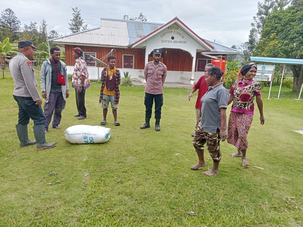 Kapolsek IPDA Samladin bersama anggota, Aipda Eduard Ayakeding dan Bripda Doga Logo, menyerahkan 1 sak beras (50 kg) kepada Kepala Kampung, Sdr. Alintago Wantik, di halaman kantor kampung.