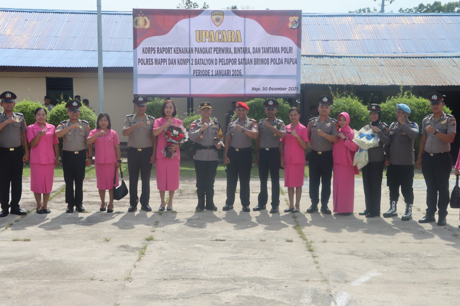 Mappi – Sebanyak 14 personil Polres Mappi dan 3 personil Brimob Kompi 2 Batalyon D Pelopor Mappi resmi menyandang pangkat baru dalam upacara krops raport yang digelar di Lapangan Upacara Polres Mappi, Selasa (30/12/2025). Kenaikan pangkat ini merupakan bentuk apresisasi atas dedikasi dan kinerja selama masa bakti berjalan.
