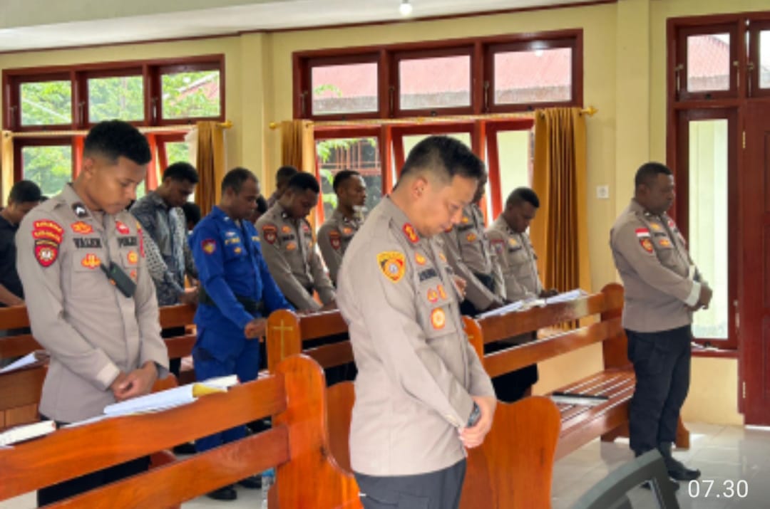 Kapolres Sarmi Bersama PJU dan Personel Ikuti Binrohtal di Gedung Bintal Polres Sarmi