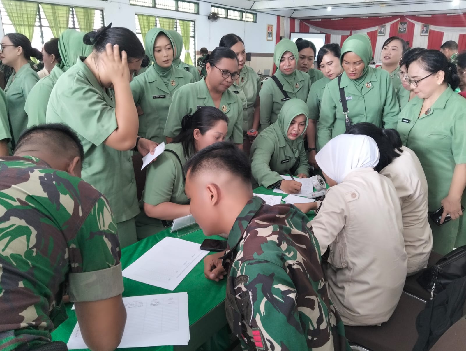 Usai penyuluhan, kegiatan dilanjutkan dengan pemeriksaan kesehatan meliputi pengecekan tekanan darah, kadar gula darah, serta konsultasi medis bagi seluruh peserta. Antusiasme terlihat dari para Prajurit, PNS, dan anggota Persit yang memanfaatkan kesempatan tersebut untuk mengetahui kondisi kesehatannya.