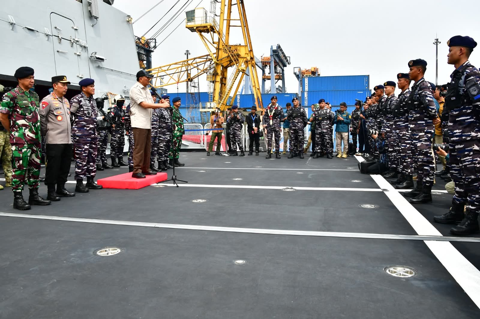 Jakarta – (Puspen TNI). Panglima TNI Jenderal TNI Agus Subiyanto mendampingi Menteri Pertahanan Republik Indonesia Jenderal TNI (Purn) Sjafrie Sjamsoeddin dan Kepala Staf Angkatan Laut (Kasal) Laksamana TNI Dr. Muhammad Ali menyambut kedatangan KRI Brawijaya-320 (KRI BWJ-320), bertempat di Dermaga 107, Pelabuhan Tanjung Priok, Jakarta Utara. Senin (8/9/2025).
