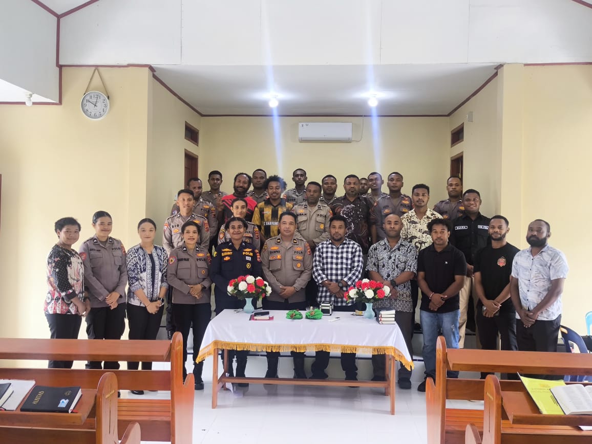 Sarmi – Personel Polres Sarmi yang beragama Kristen melaksanakan kegiatan Bimbingan Rohani (Binroh) di Gedung Bintal Polres Sarmi, Kamis (09/10/2025). Kegiatan ini merupakan bagian dari program rutin pembinaan mental dan spiritual bagi anggota Polri agar senantiasa memiliki iman yang kuat, karakter yang baik, serta semangat pengabdian dalam menjalankan tugas kepolisian.