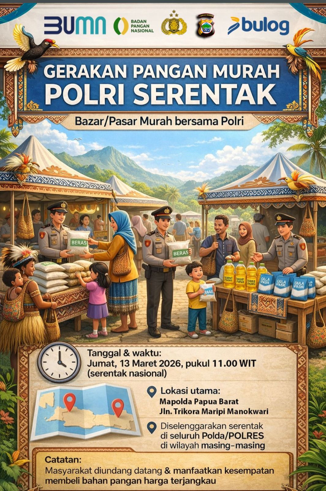 Manokwari – Polda Papua Barat bekerja sama dengan Perum Bulog akan menggelar kegiatan Gerakan Pangan Murah (GPM) bagi masyarakat. Kegiatan ini akan dilaksanakan pada Jumat, (13/3) 2026 pukul 11.00 WIT bertempat di Polda Papua Barat.