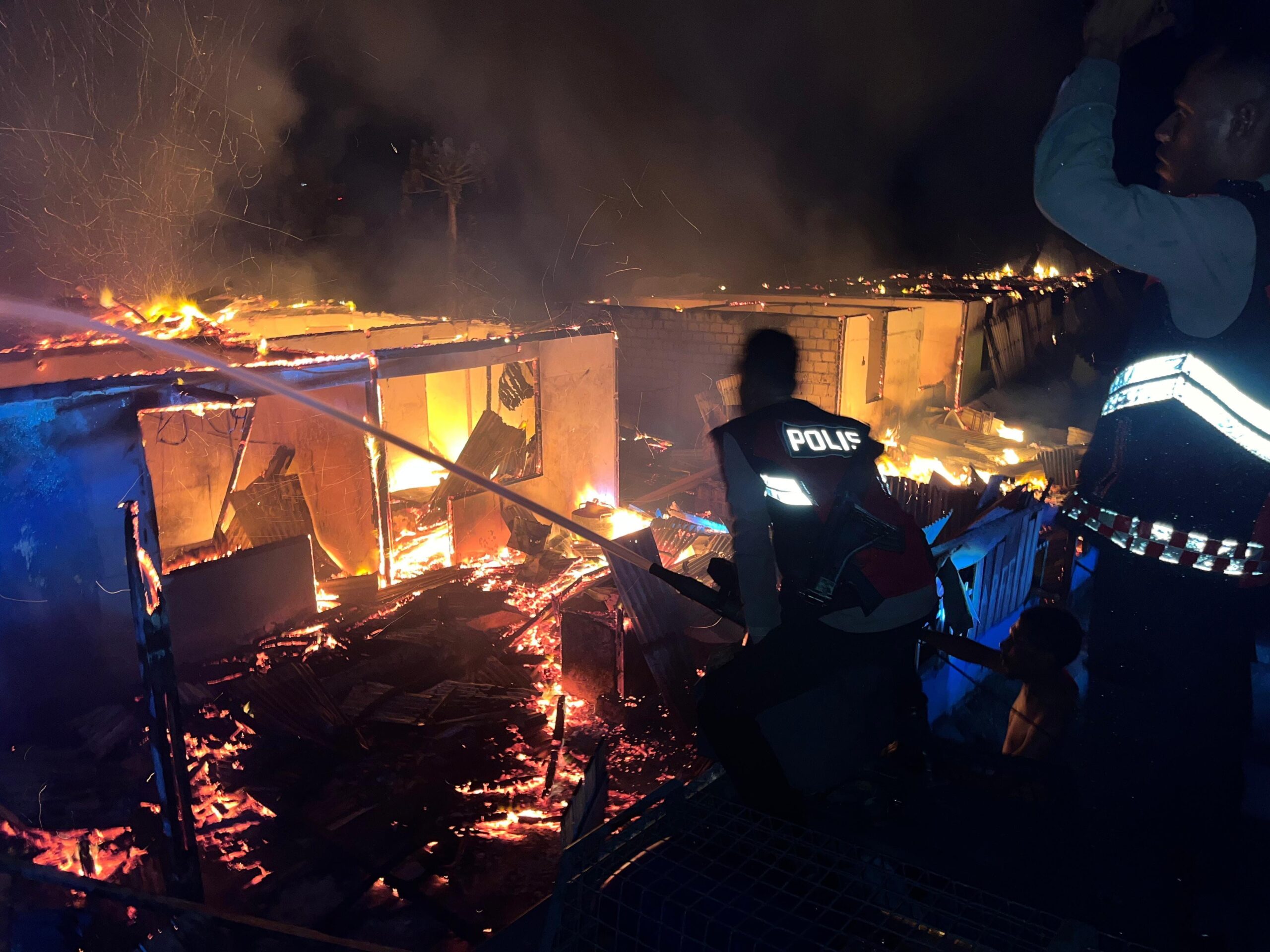 Sarmi – Polres Sarmi melalui Pos Shelter sat samapta polres Sarmi bersama personel Polsek Sarmi Kota dengan sigap merespon kejadian kebakaran yang terjadi pada Minggu dini hari sekitar pukul 02.05 WIT di Kampung Sarmo, Distrik Sarmi Kota. Kebakaran tersebut menghanguskan rumah kos milik Bapak Edwin Matadoar yang disewakan kepada Ibu Kartia dan dijadikan kios, serta menjalar ke bangunan di sisi kiri dan kanan.
