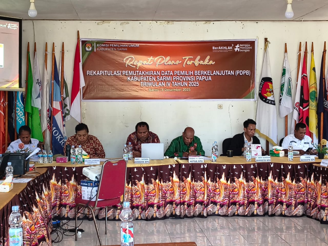 Sarmi – Komisi Pemilihan Umum (KPU) Kabupaten Sarmi menyelenggarakan Rapat Pleno Terbuka Rekapitulasi Pemutakhiran Data Pemilih Berkelanjutan (PDPB) Triwulan IV Tahun 2025, pada Senin, 8 Desember 2025, bertempat di Aula Kantor KPU Sarmi, Distrik Sarmi Selatan.