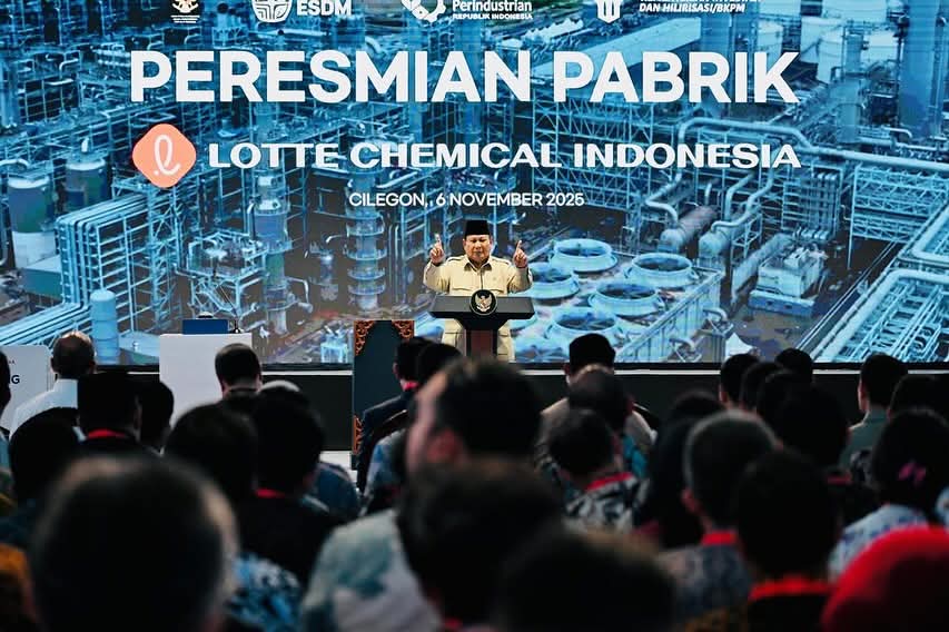 Jakarta – Presiden Prabowo Subianto meresmikan pabrik Lotte Chemical Indonesia (LCI) di Kota Cilegon, Provinsi Banten, Kamis (06/11/2025). Acara peresmian ini menandai beroperasinya salah satu proyek industri petrokimia yang menjadi tonggak penting dari upaya pemerintah memperkuat hilirisasi industri nasional.