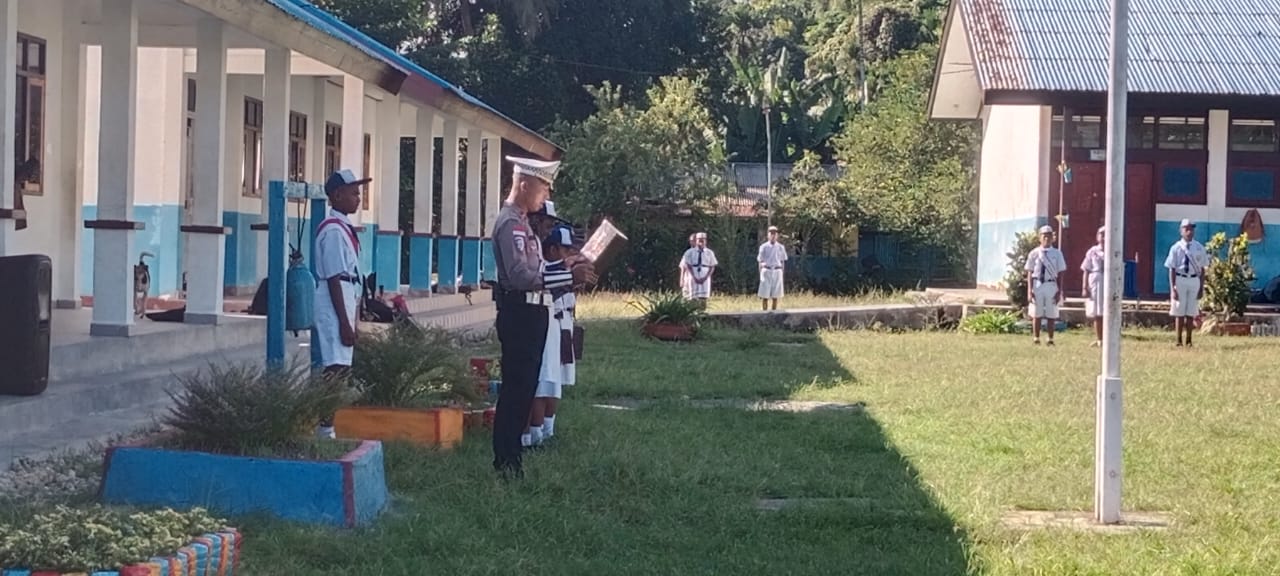 Kegiatan tersebut dipimpin oleh KBO Sat Lantas Polres Sarmi, Ipda Mulyadi, S.Sos, yang bertindak sebagai Inspektur Upacara (Irup) dalam pelaksanaan upacara bendera di sekolah tersebut.