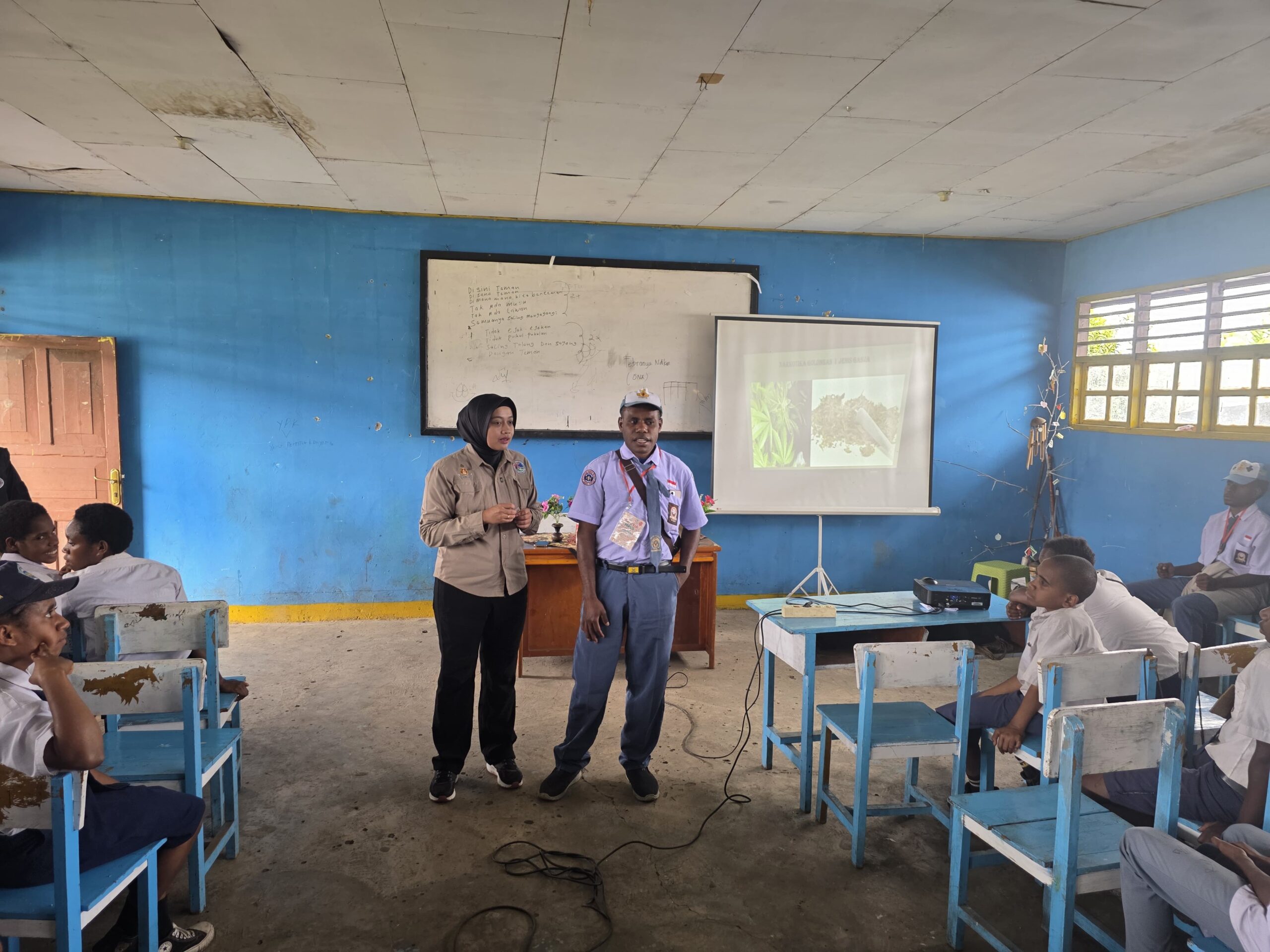Dalam sesi penyuluhan, pemateri menunjukkan contoh barang bukti narkotika jenis ganja dan sabu agar siswa dapat mengenali ciri-ciri dan bentuknya. Penyampaian materi dilanjutkan dengan penjelasan mengenai ancaman hukuman serta pasal-pasal yang mengatur penyalahgunaan narkotika sesuai peraturan perundang-undangan.