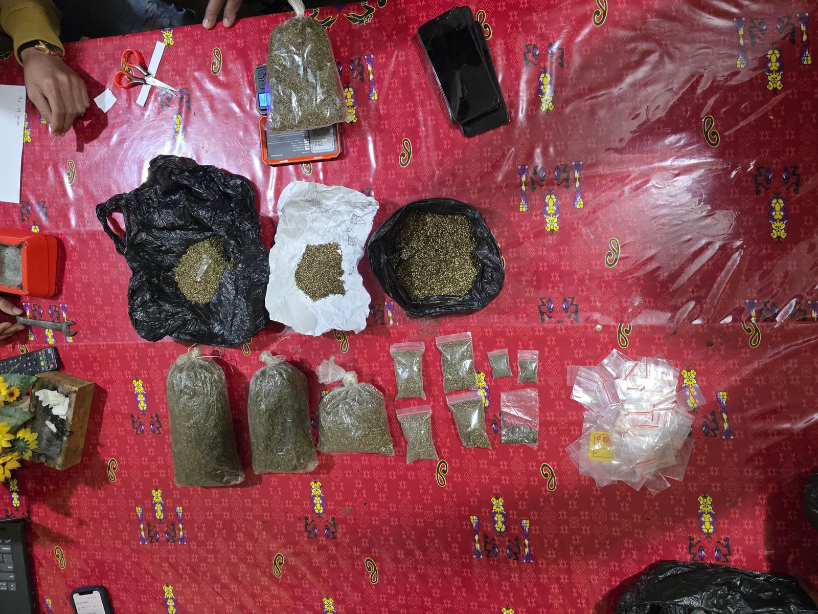 Dari hasil penggeledahan, polisi mengamankan sejumlah barang bukti berupa ganja kering dan biji ganja dengan berbagai ukuran kemasan plastik. Total berat keseluruhan barang bukti mencapai 552,06 gram.