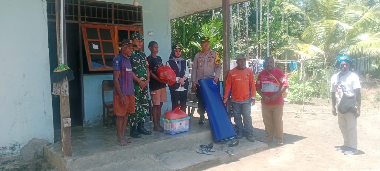 Sarmi – Kapolsek Pantai Timur Ipda T. Prasetyo Adji, S.Sos bersama anggotanya mendampingi kegiatan penyerahan bantuan sosial oleh Ibu Wakil Bupati Sarmi Hj. Jumriati, didampingi tim BPBD Kabupaten Sarmi, kepada warga terdampak musibah gempa bumi di Kampung Dabe II, Distrik Pantai Timur Barat, Kabupaten Sarmi, pada Jumat, 17 Oktober 2025.