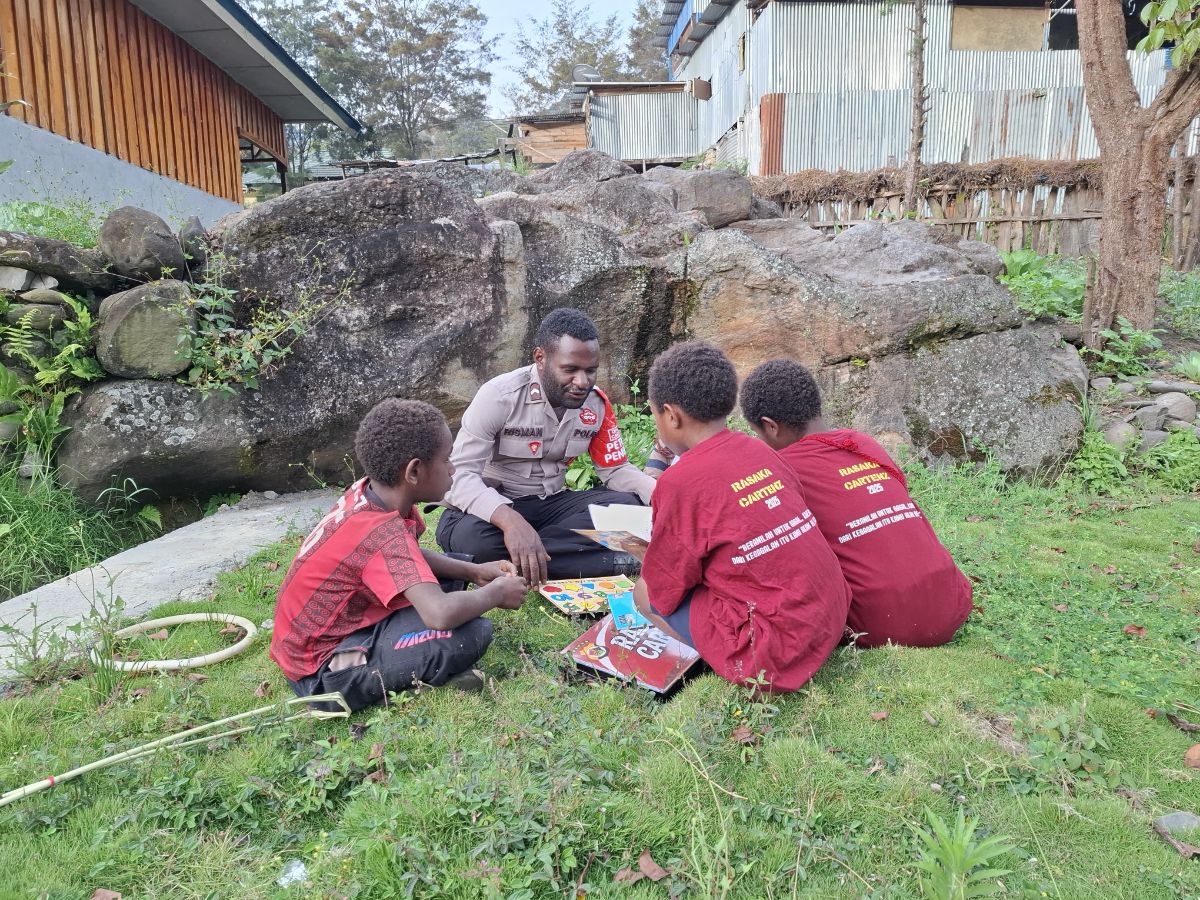Subsatgas Si-Ipar Polres Lanny Jaya yang tergabung dalam Operasi Rasaka Cartenz 2025 melaksanakan kegiatan Polisi Pi Ajar bagi anak-anak di Kampung Yogobak, Distrik Nogi, Kabupaten Lanny Jaya.