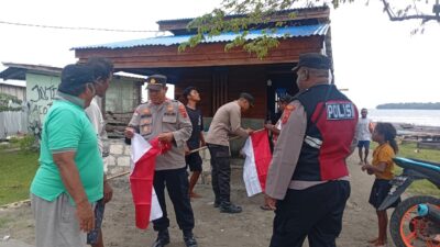 Kapolsek Sarmi Kota Bagikan Bendera Merah Putih kepada Warga Menyambut HUT RI