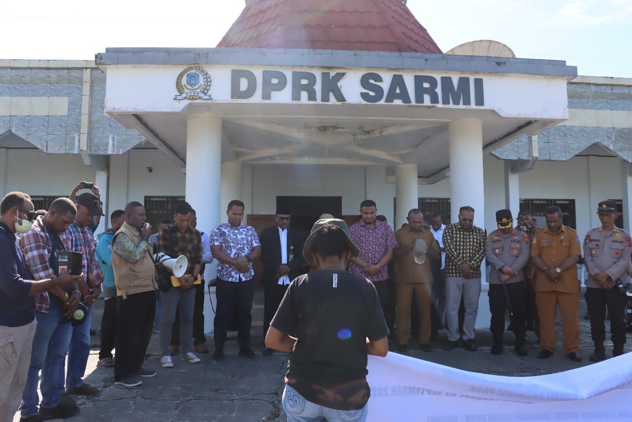 Sarmi – Kapolres Sarmi AKBP Ruben Palayukan, S.Pt., S.I.K., bersama Forkopimda Kabupaten Sarmi dan massa pengunjuk rasa menggelar doa bersama di depan Kantor DPRK Sarmi, Selasa (02/09/2025) kemarin. Kegiatan ini dilaksanakan usai penyampaian aspirasi masyarakat yang telah diterima langsung oleh Bupati Sarmi, Wakil Bupati Sarmi, serta Ketua DPRK Sarmi.