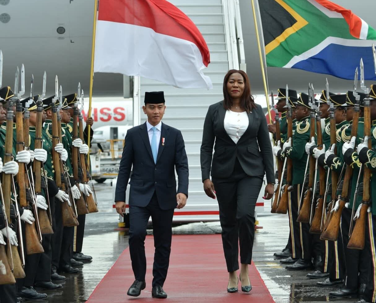 Afrika Selatan – Wakil Presiden RI Gibran Rakabuming tiba di Bandar Udara Internasional O.R. Tambo, Johannesburg, Afrika Selatan, Jumat (21/11/2025). Setibanya di apron VIP, Wapres disambut hangat dengan Tari Pantsula, tarian tradisional Afrika Selatan.